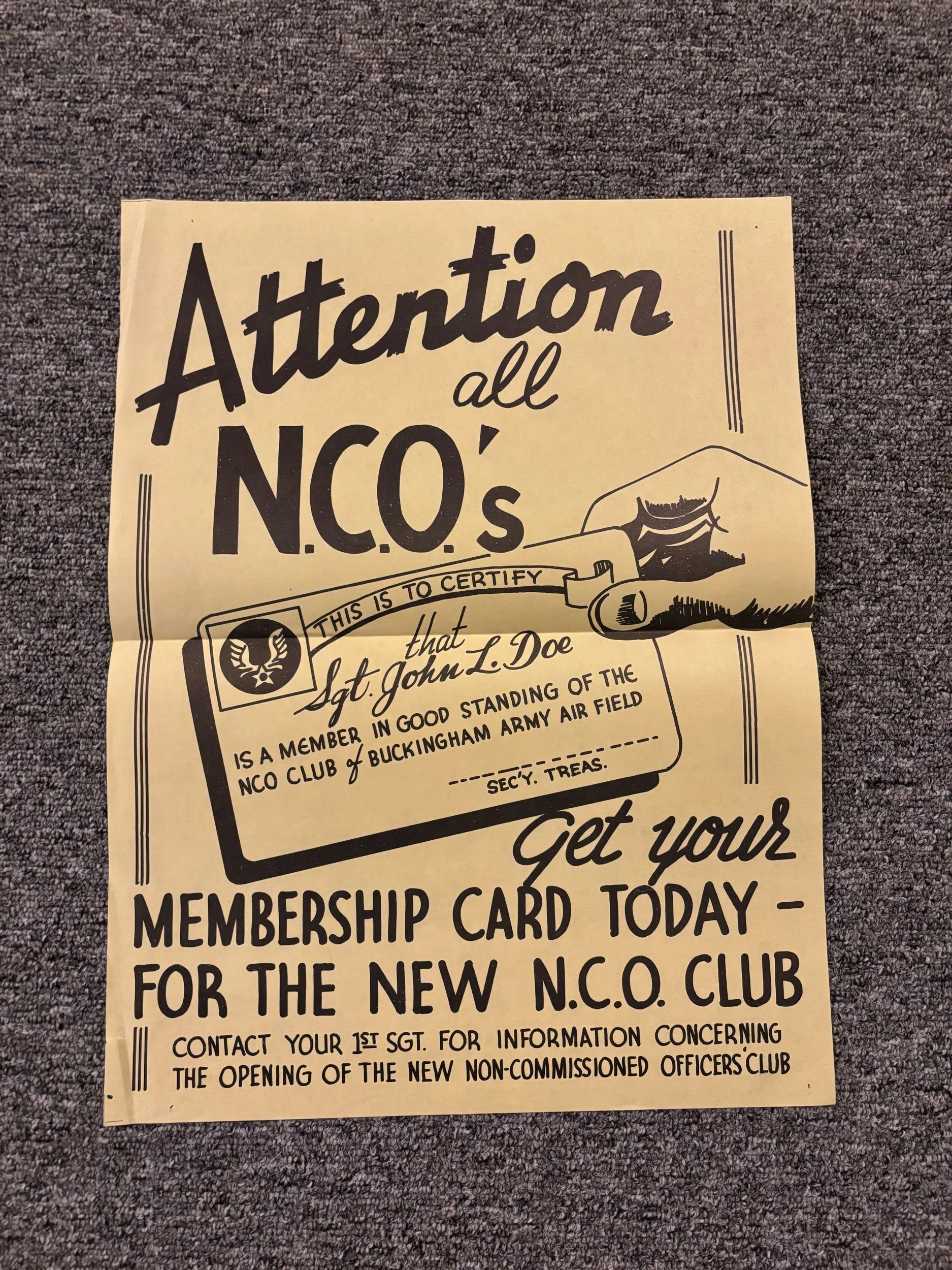 WWII poster from Buckingham Army Airfield in Fort Myers, FL. NCOs are leaders who are responsible for training, mentoring, and commanding their subordinates. This particular poster tells soldiers to get their NCO card.