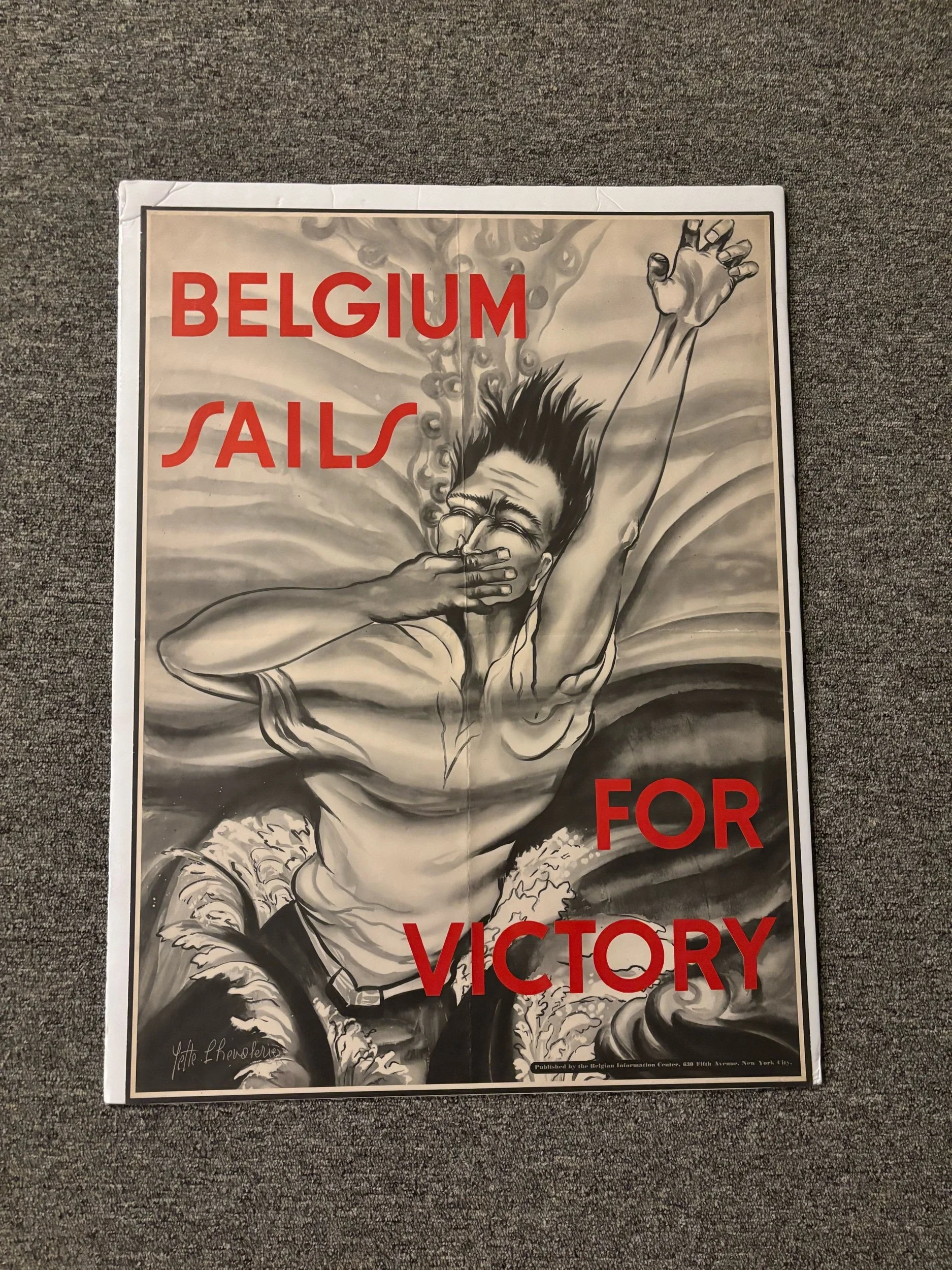 WWII poster showing the sacrifices Belgium is making for victory. Showing a man struggling in the water after an enemy attack.