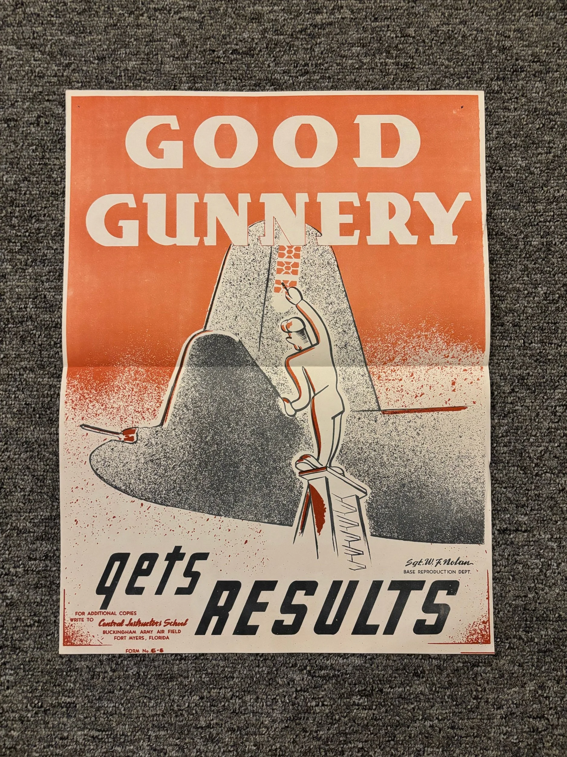 Awesome WWII poster from Buckingham Army Airfield in Fort Myers, FL. This particular poster promotes the importance of good aim, as clearly, it gets results. Featuring a pilot adding another flag to his tail!