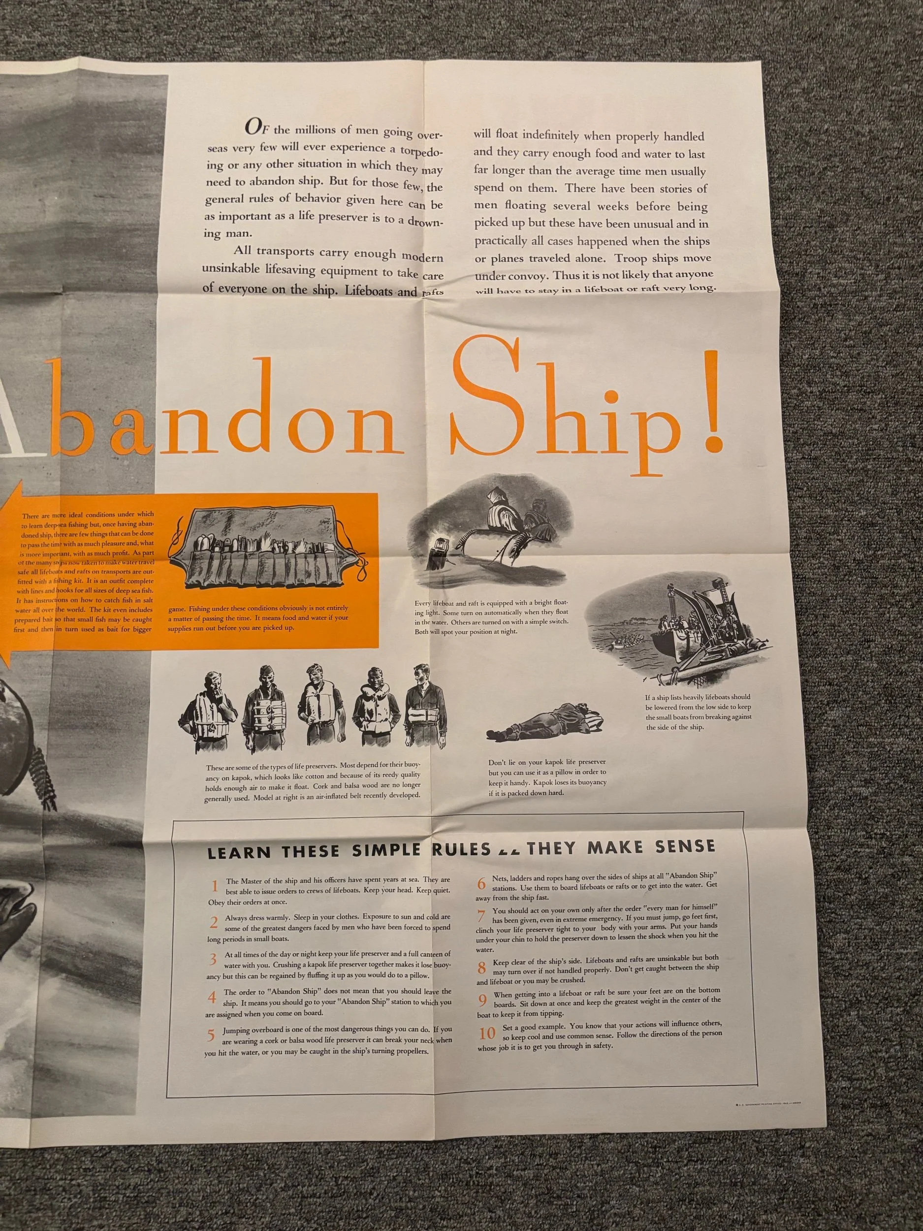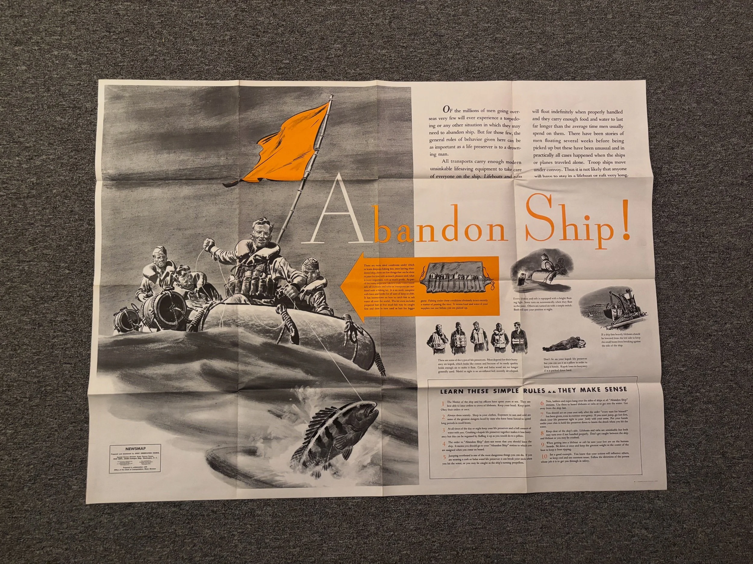 One of the better Newsmap posters we have seen, featuring stranded sailors fishing while the await rescue. The poster also gives useful tips on how to abandon ship. Newsmap on verso.