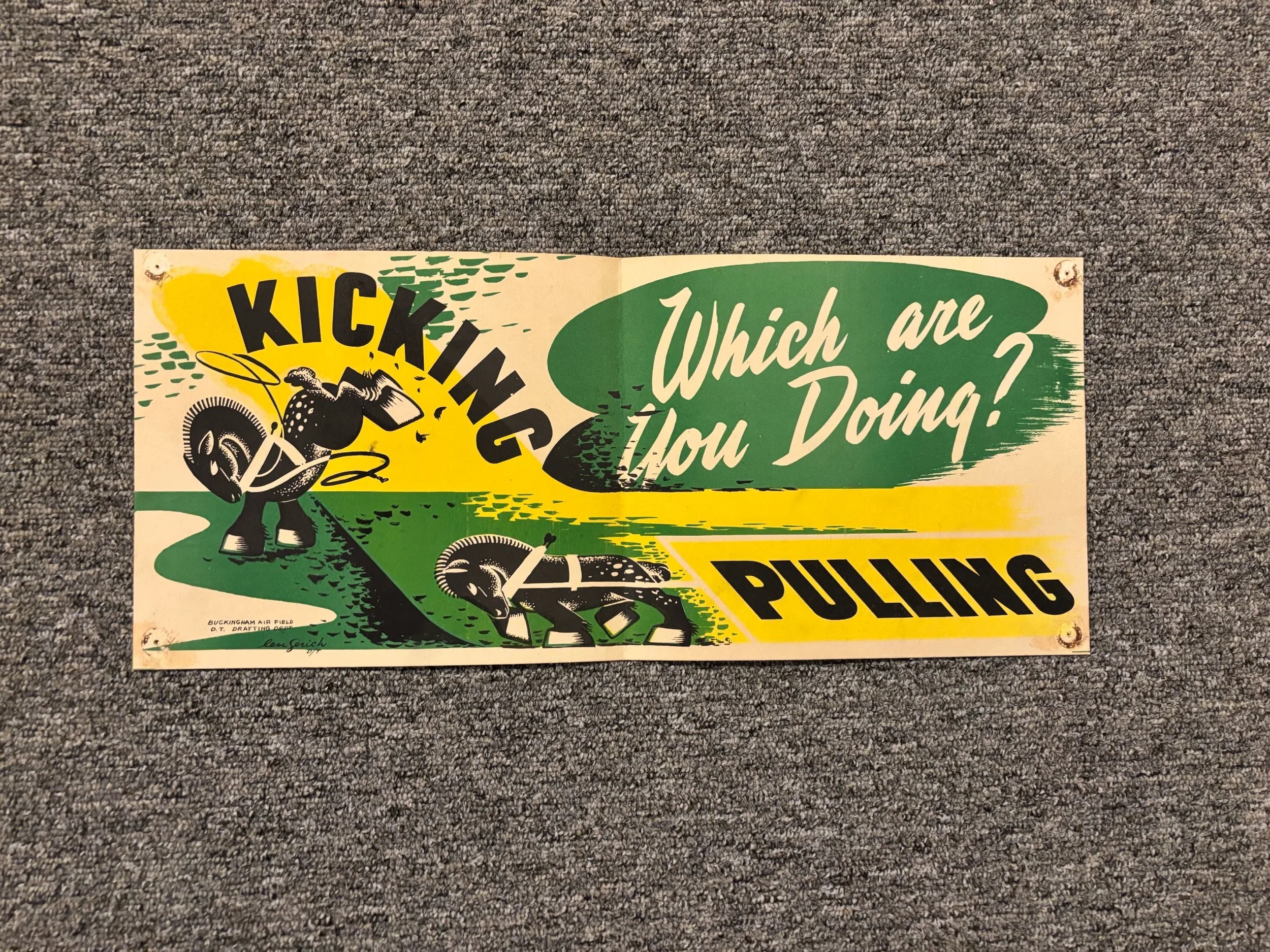 WWII poster from Buckingham Army Airfield in Fort Myers, FL. This particular poster asks recruits if they are kicking or pulling, meaning are they helping or getting in the way.