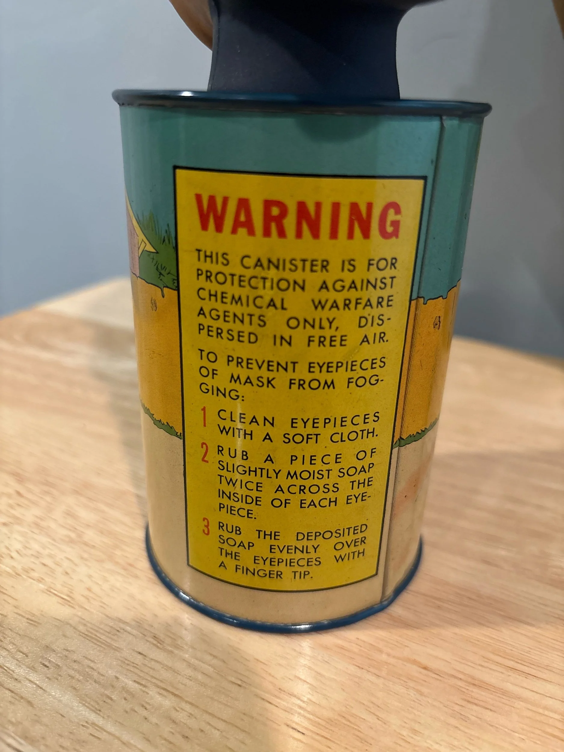 Extremely rare WWII Mickey Mouse Gas Mask by the Sun Rubber Company. Regular gas masks were scary to children so the owner of the Sun Rubber Company pitched an idea to Walt Disney to create a more child friendly version. Walt loved the idea, and in 1942, the masks were created. Shortly thereafter, rubber rationing took place, and the masks were cancelled and mostly scrapped. The litho tin canister is made by Ohio Art, Bryan O. The production was entirely in Ohio as Sun Rubber was also in the state.
