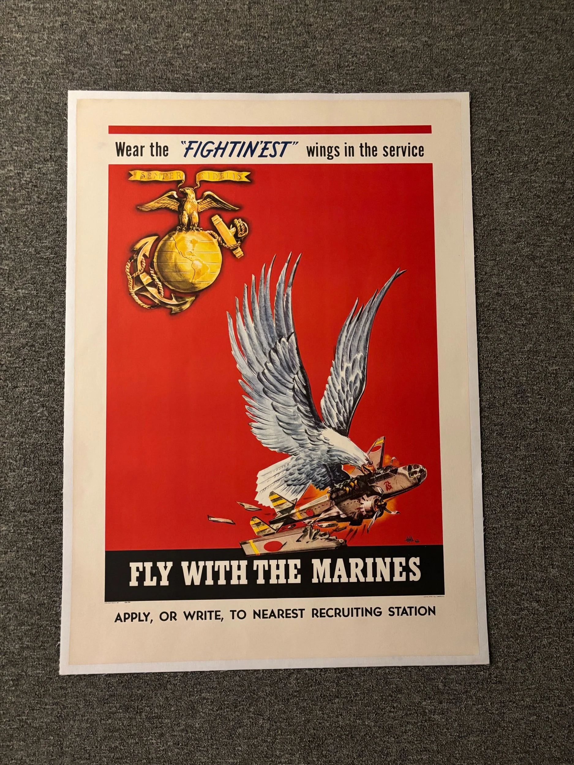 A fantastic recruitment poster for the Marines. Featuring an American Bald Eagle taking down a Japanese aircraft. Enticing men to join up with the “Fightin’est” wings in the service.