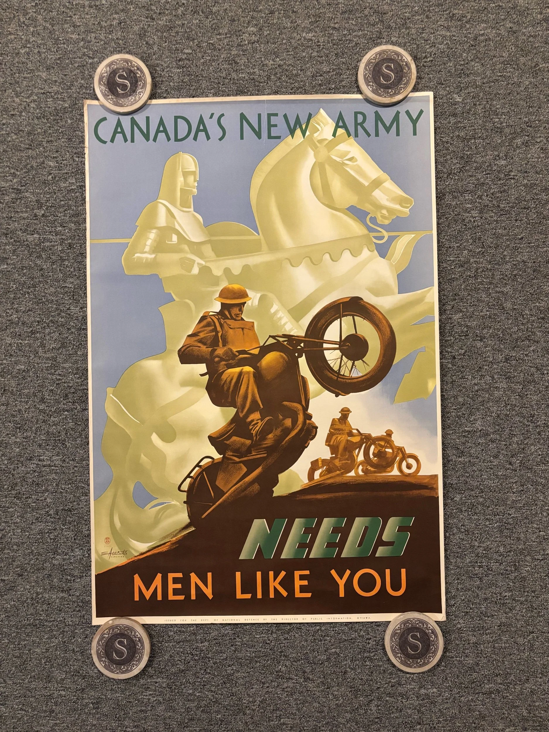 Rare WWII Canadian recruitment poster calling for men to join the Army. Issued for the Department Of Defense by the Director of Public Information. Printed in Ottawa. Excellent graphics featuring a soldier on a motorcycle with a mounted soldier in the background. Great history behind this one.