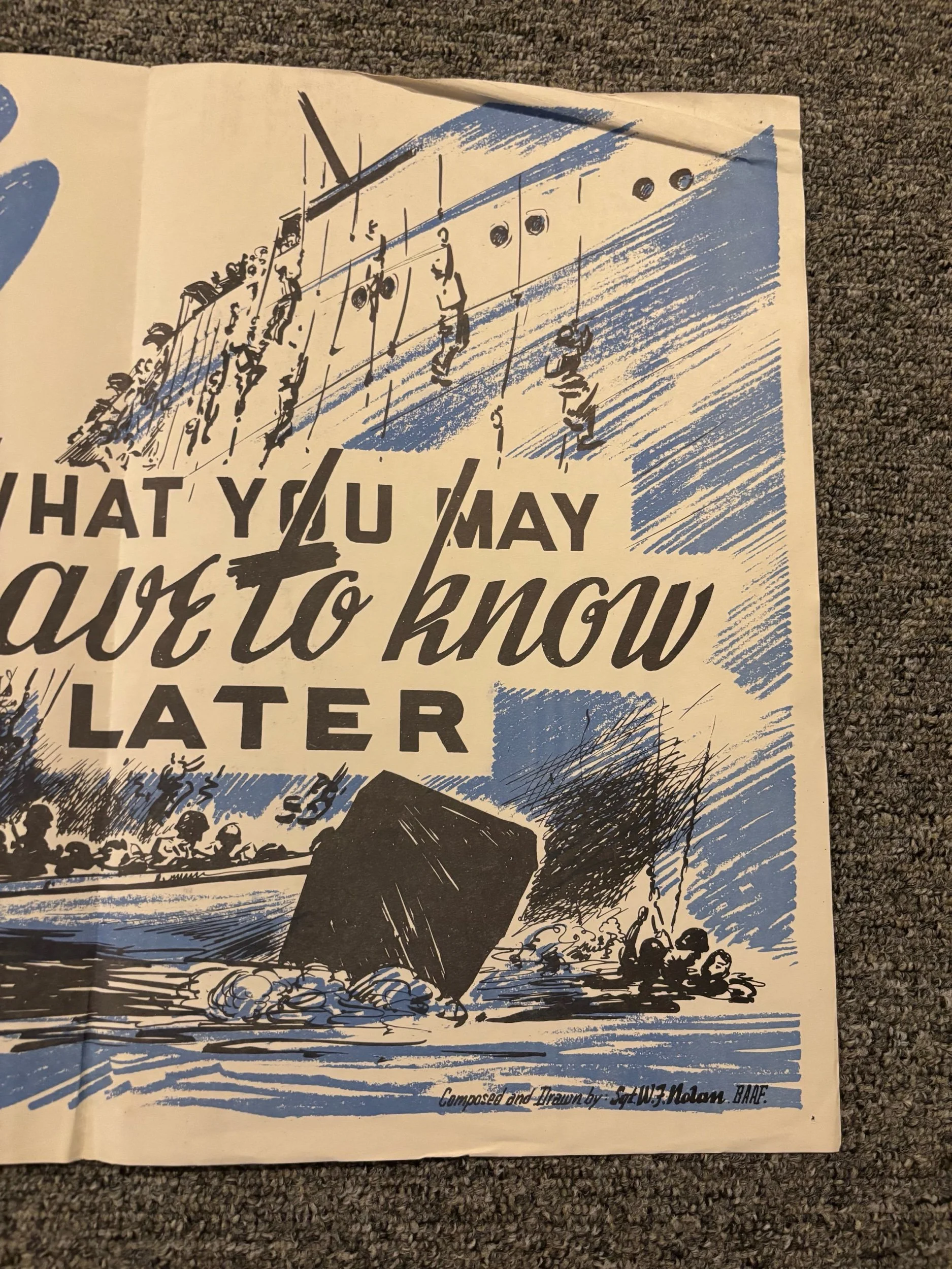 WWII poster from Buckingham Army Airfield in Fort Myers, FL. This particular poster stresses the importance learning what you need to know as you may have to know it later. Featuring an abandonment of a ship.