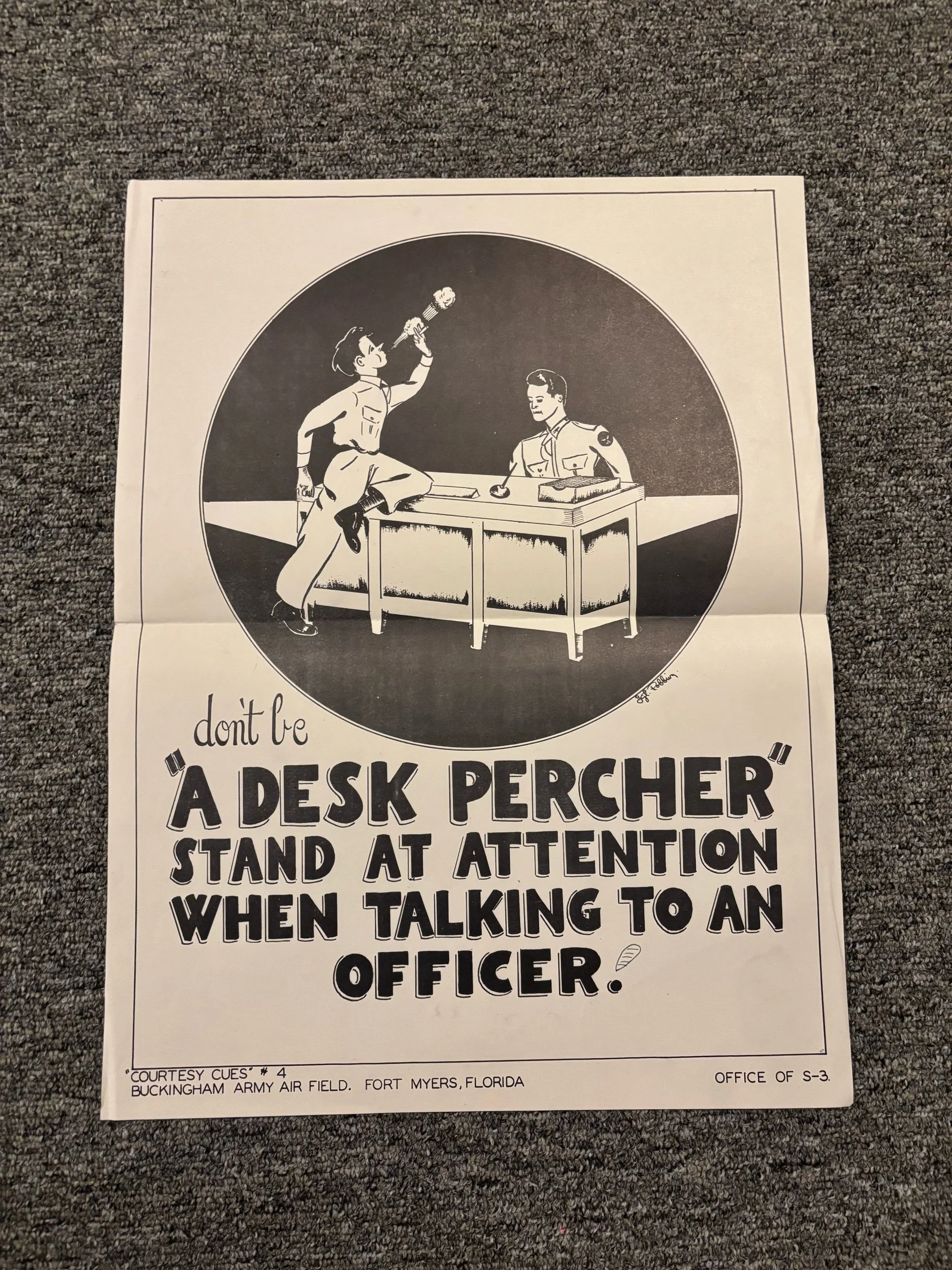 WWII poster from Buckingham Army Airfield in Fort Myers, FL. This particular poster shows the importance of being a proper soldier. Stand at attention!