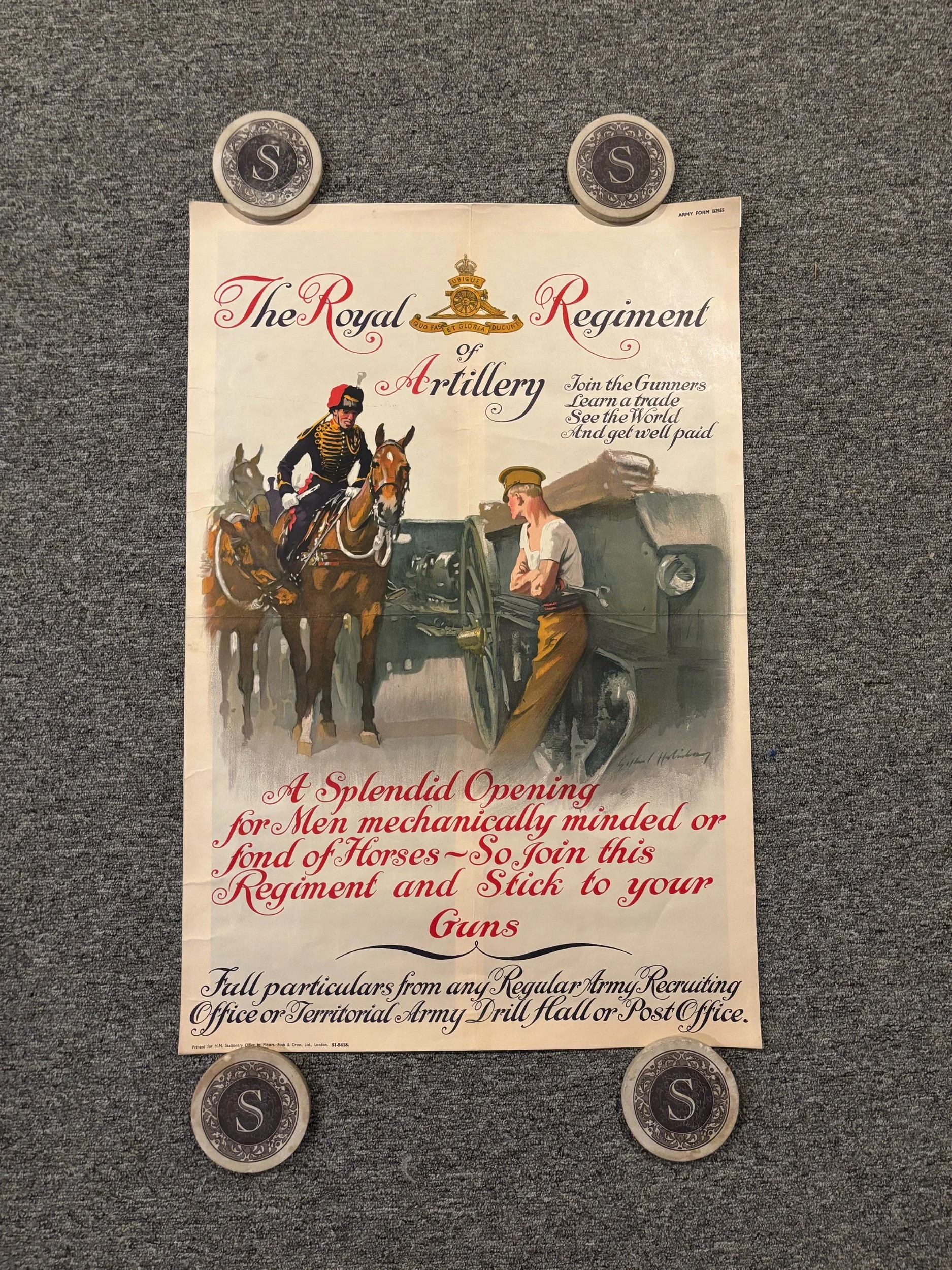 The only example known to exist! The Royal Regiment Artillery, looking for men who are mechanically minded or fond for horses. This fantastic WWI poster features a mounted unit with artillerymen along side him. Printed for H.M. Stationery Office by Messrs. Fosh & Cross, Ltd., London. We cannot find a single other example of this rare poster, not even the Imperial War Museum has a copy.