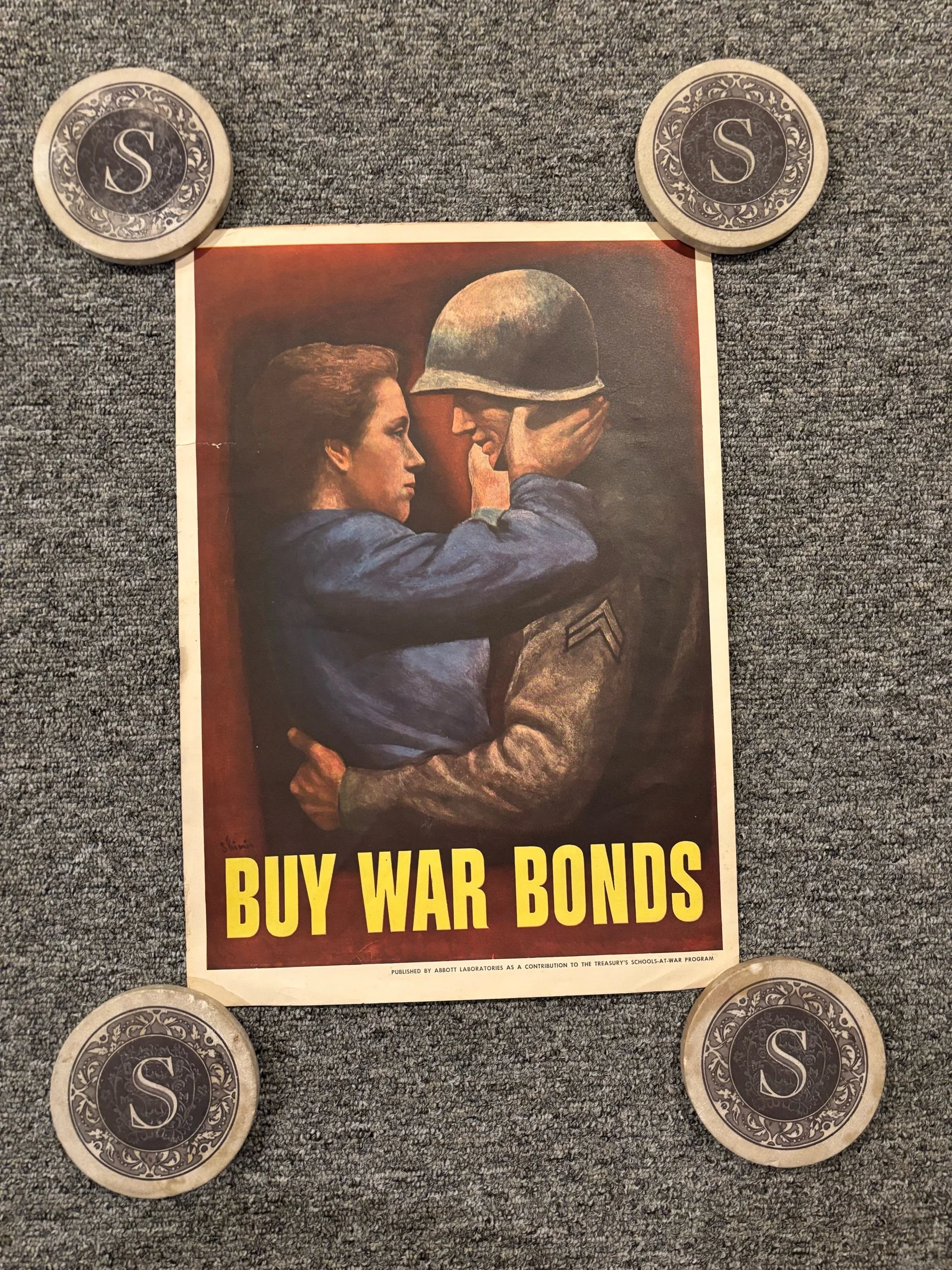 WWII poster privately printed by Abbott Labs to help promote the sale of war bonds. This particular poster shows a serviceman coming home to his wife. telling citizens on the Homefront to buy war bonds.