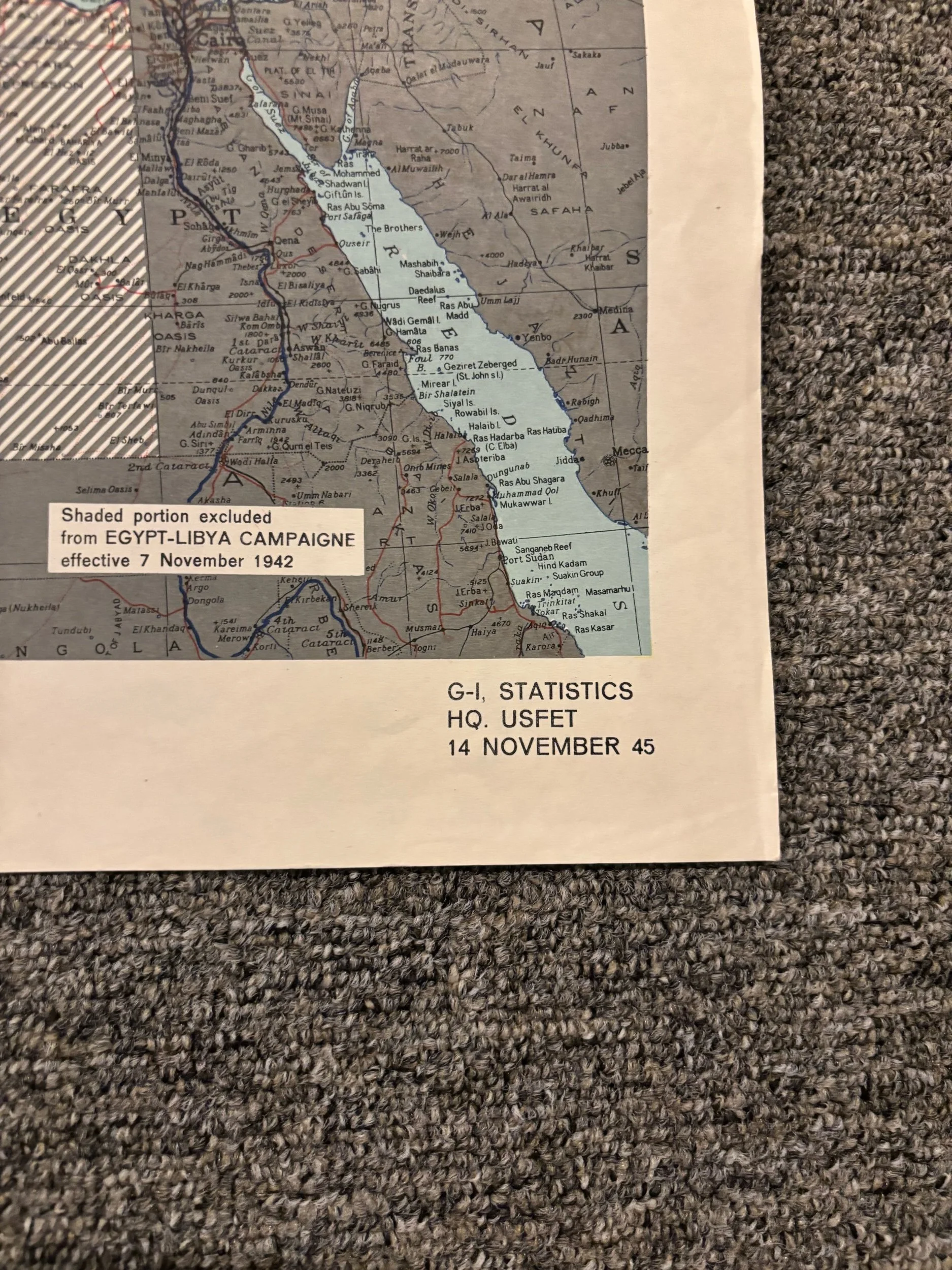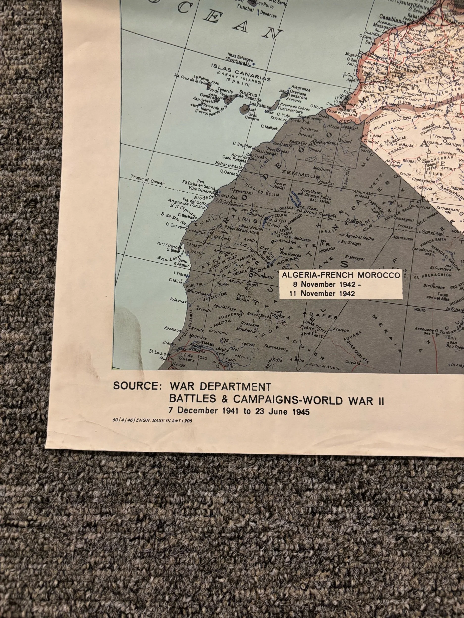 WWII poster map from Buckingham Army Airfield in Fort Myers, FL. This is a standard troop information map showing battles and campaigns in the European and African theater.