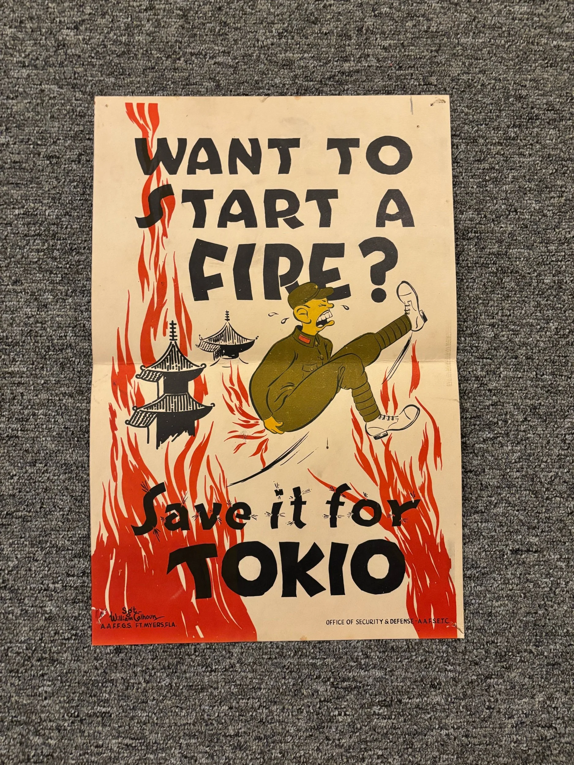 WWII anti axis poster from Buckingham Army Airfield in Fort Myers, FL. This particular poster stresses the importance of fire safety, and to save it for the enemy.