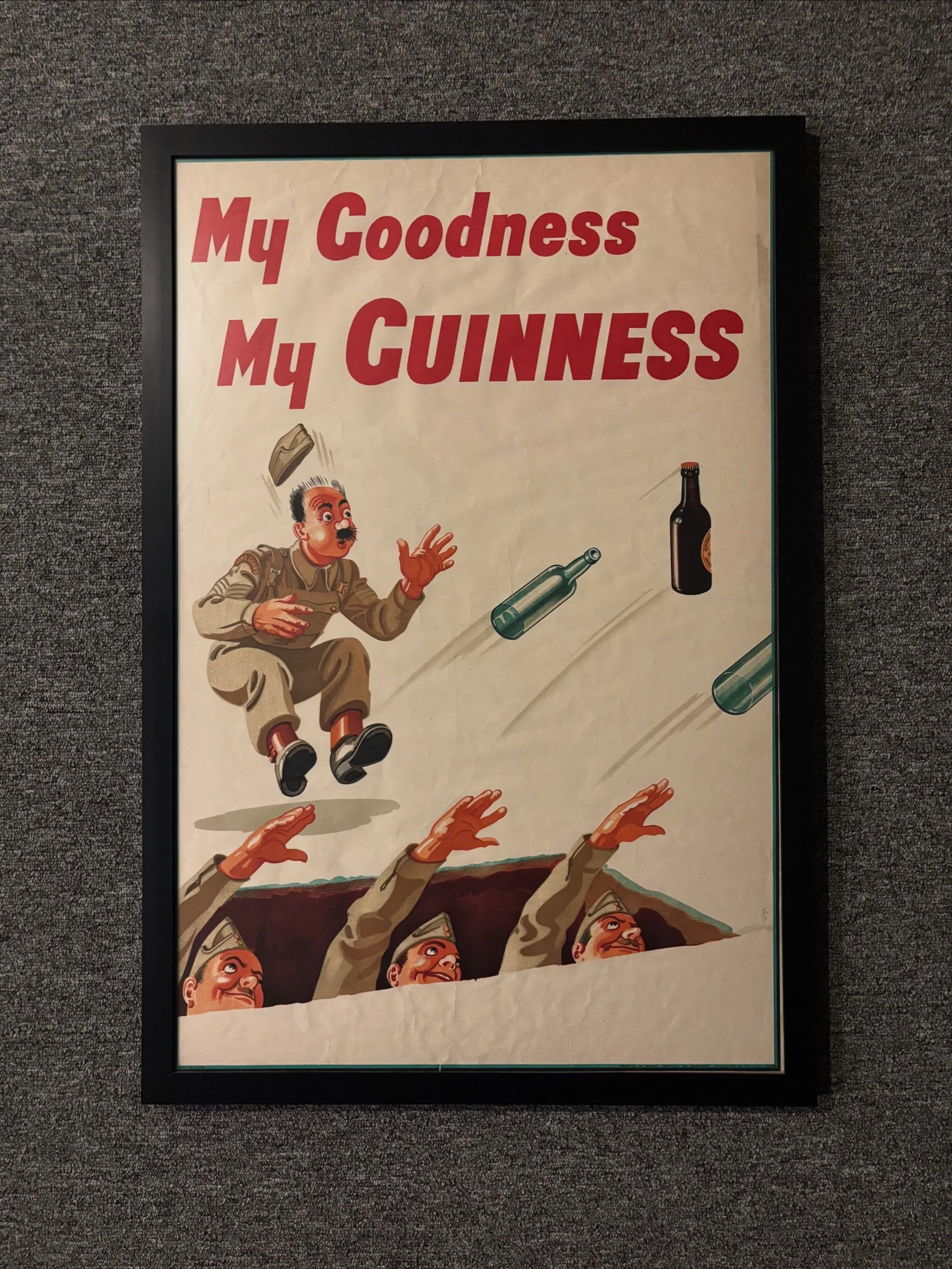 Extremely rare WWII poster by John Gilroy for Guinness. Using the famous phrases “My Goodness, My Guinness” showing troops hurling empty bottles along with his beloved Guinness beer. NOTE: John Gilroy Guinness posters are the most faked series of posters on earth. This is a guaranteed origial.