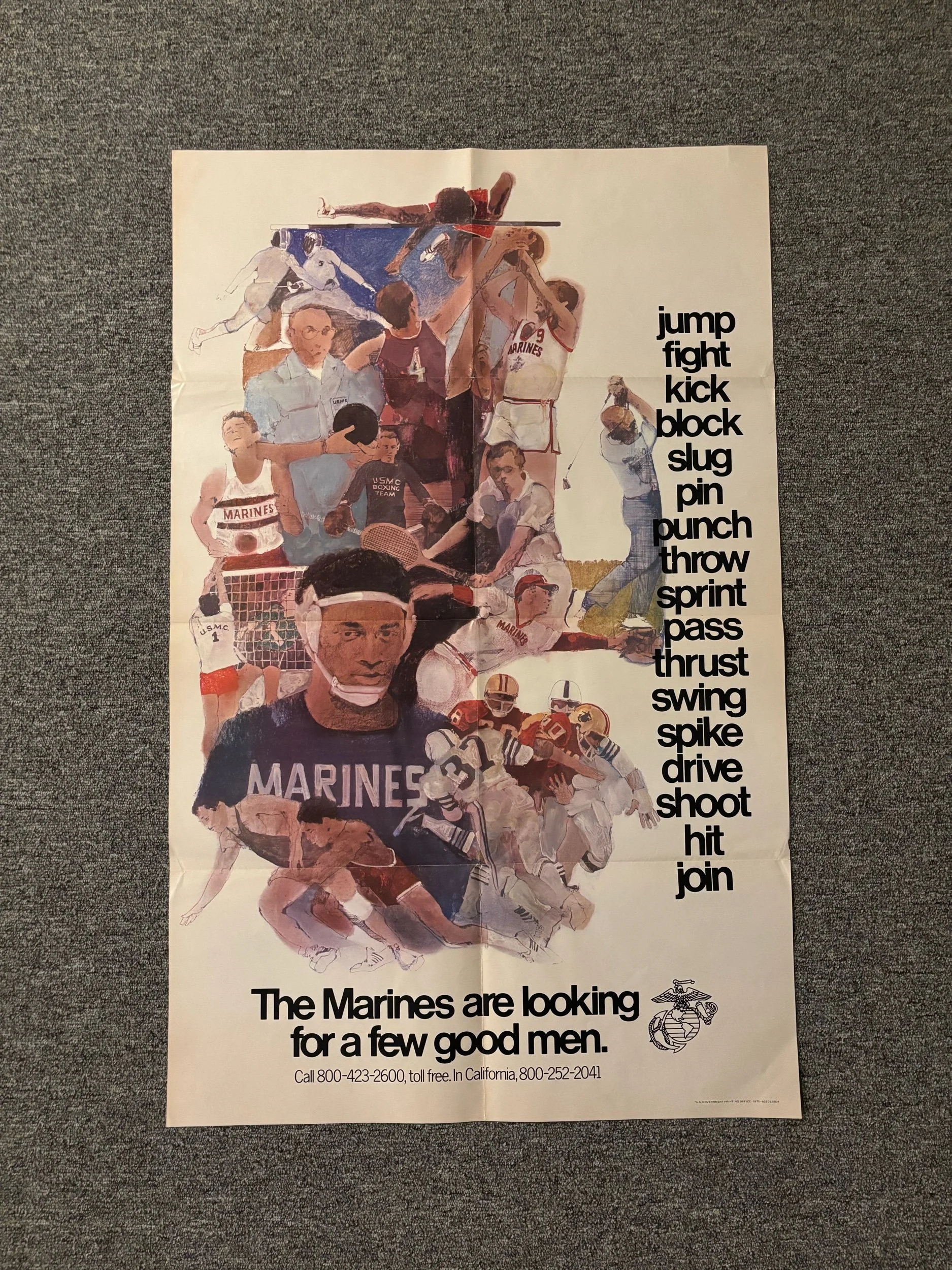 A rare Vietnam era recruitment poster for the Marines. Printed in 1975, this poster looks for those at the top of their game of various sports to consider service to their country.