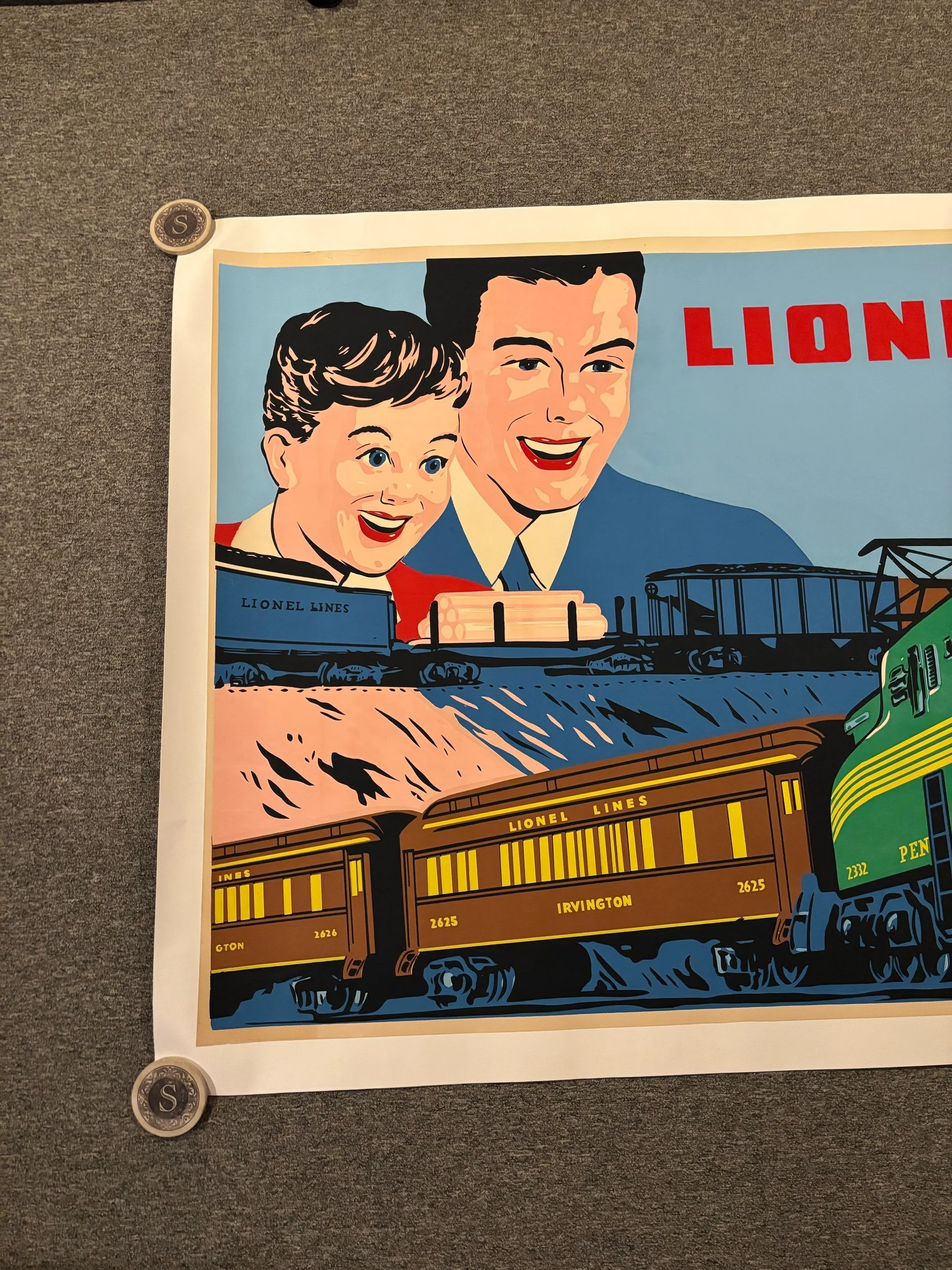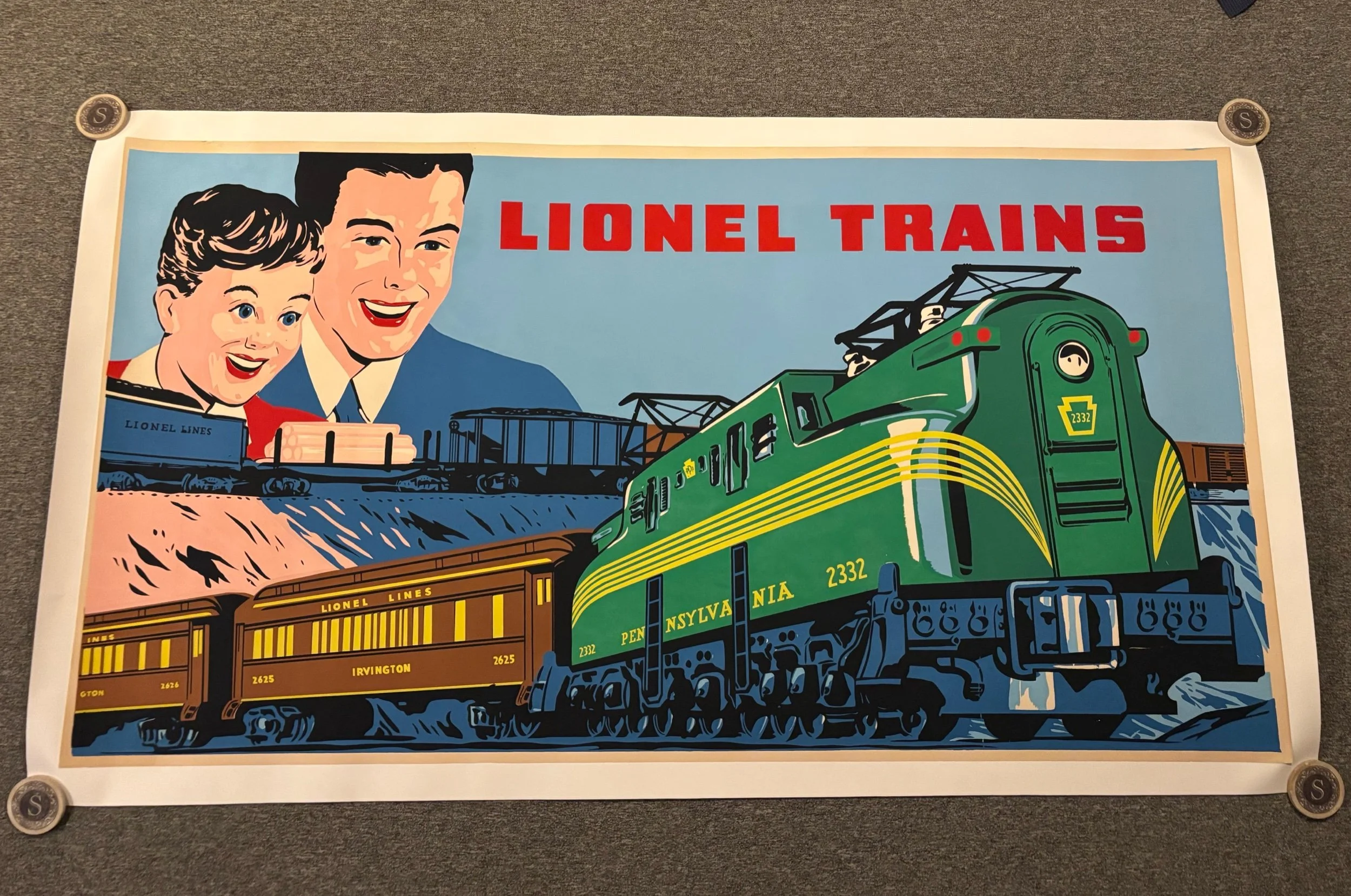 Rare and large Lionel Trains dealership poster. Featuring a GG1 pulling Madison passenger cars. Circa 1949.
