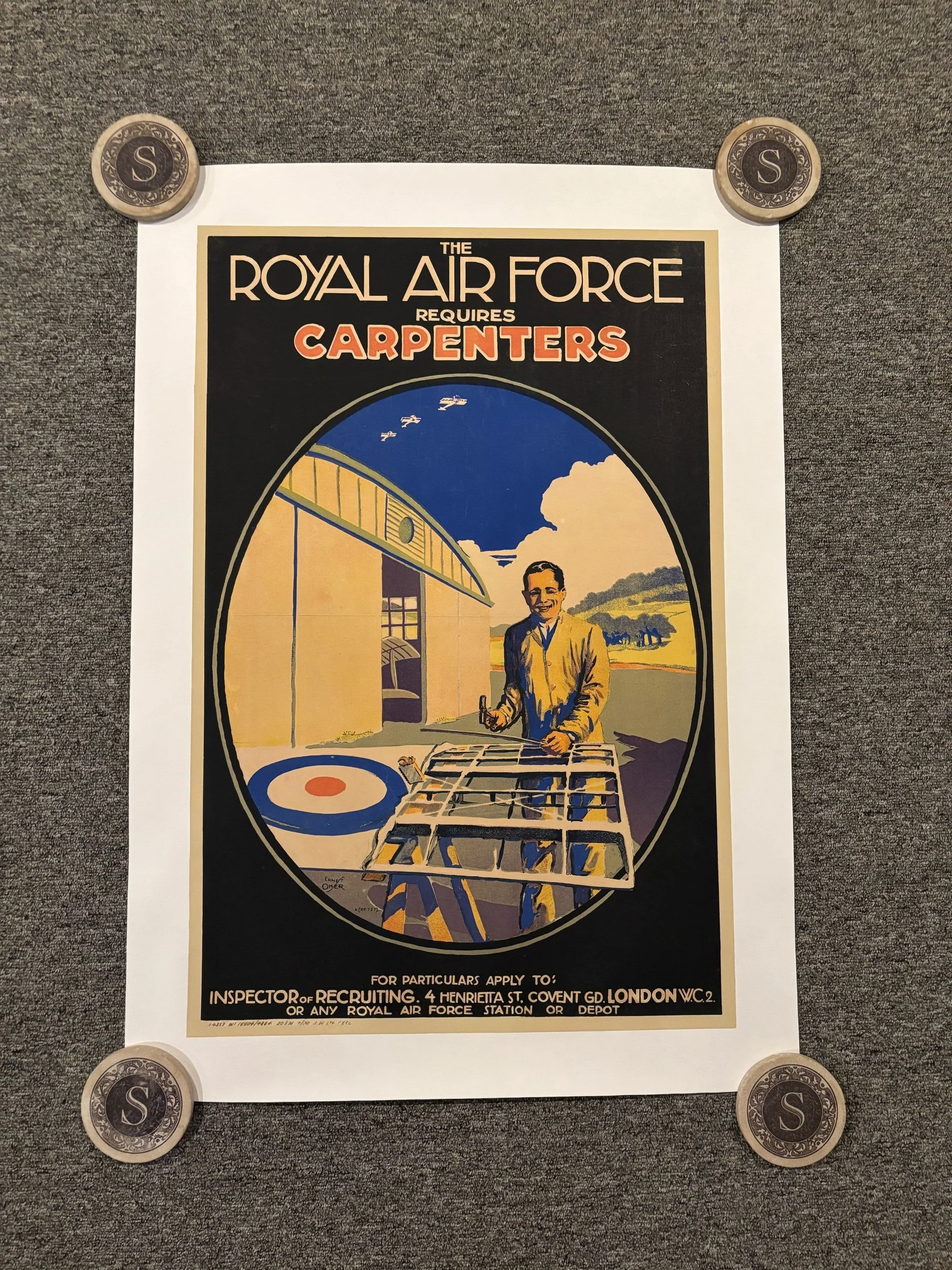 An extremely rare WWI British poster for the Royal Air Force. This particular poster was to help recruit carpenters for building planes and encourages those interested to sign up at 4 Henrietta St. Covent Garden, in London.