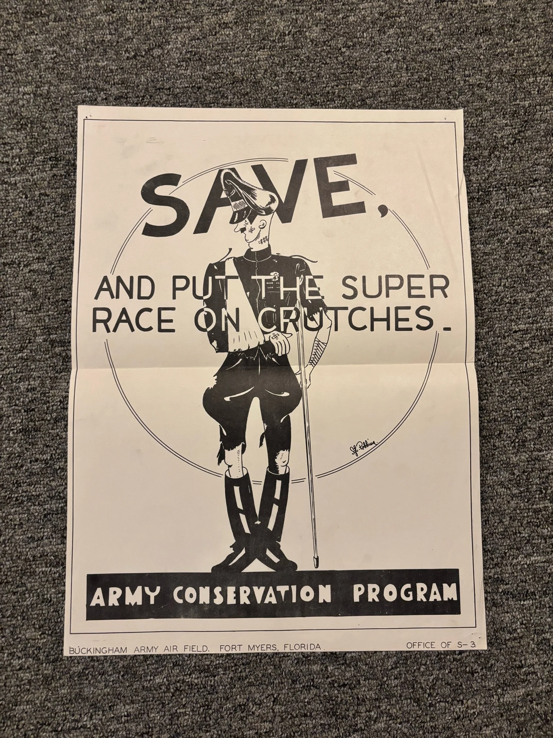 Humorous WWII poster from Buckingham Army Airfield in Fort Myers, FL. Showing Hitler on crutches and showing the men in the army how to put him on crutches, through army conservation!