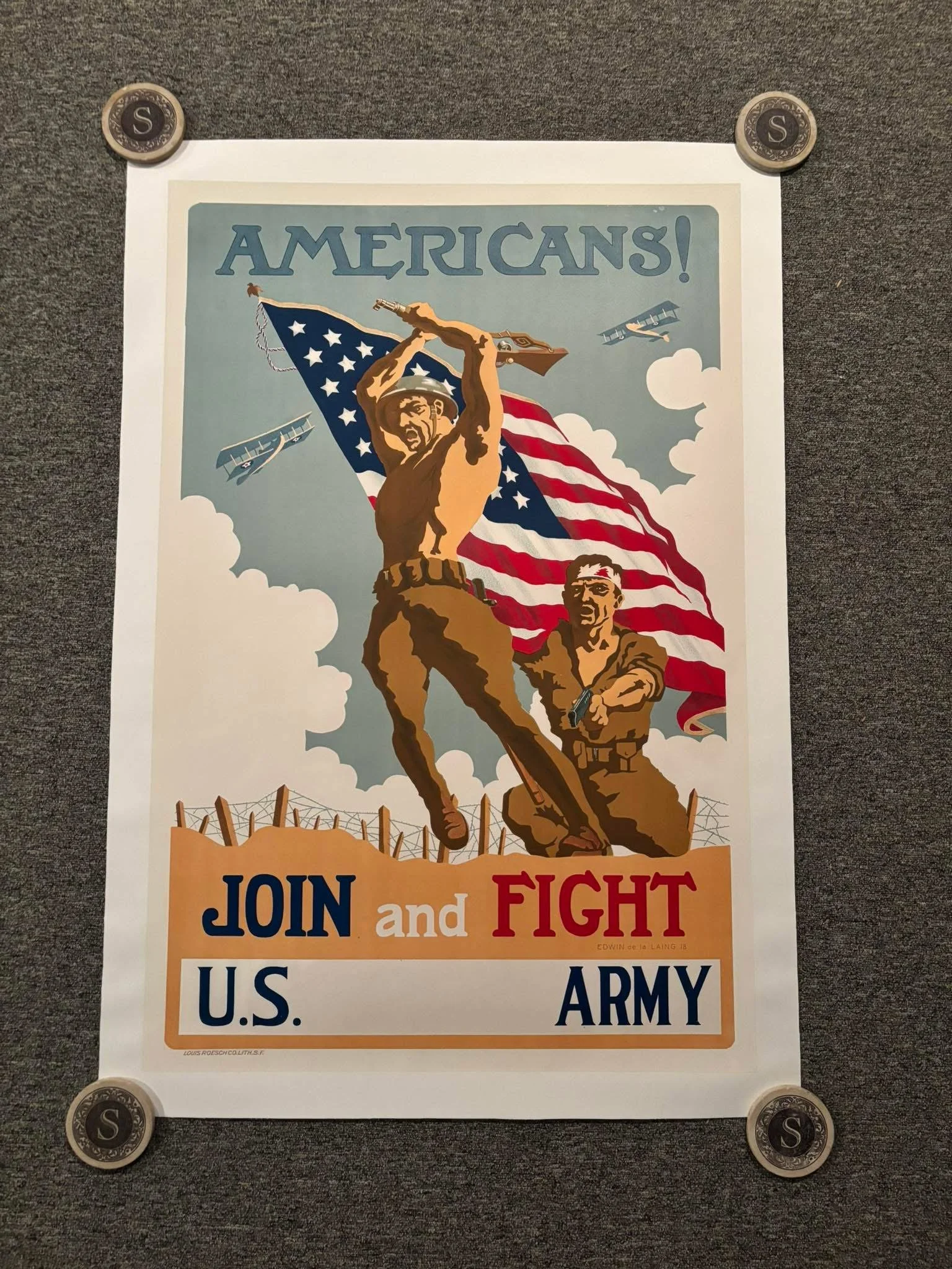 Rare Army recruitment poster from WWI. Printed in 1918 by Edwin De Laing, this beautiful artwork shows two doughboys attacking the enemy in a trench with aircraft and the American flag overhead. Simply amazing.