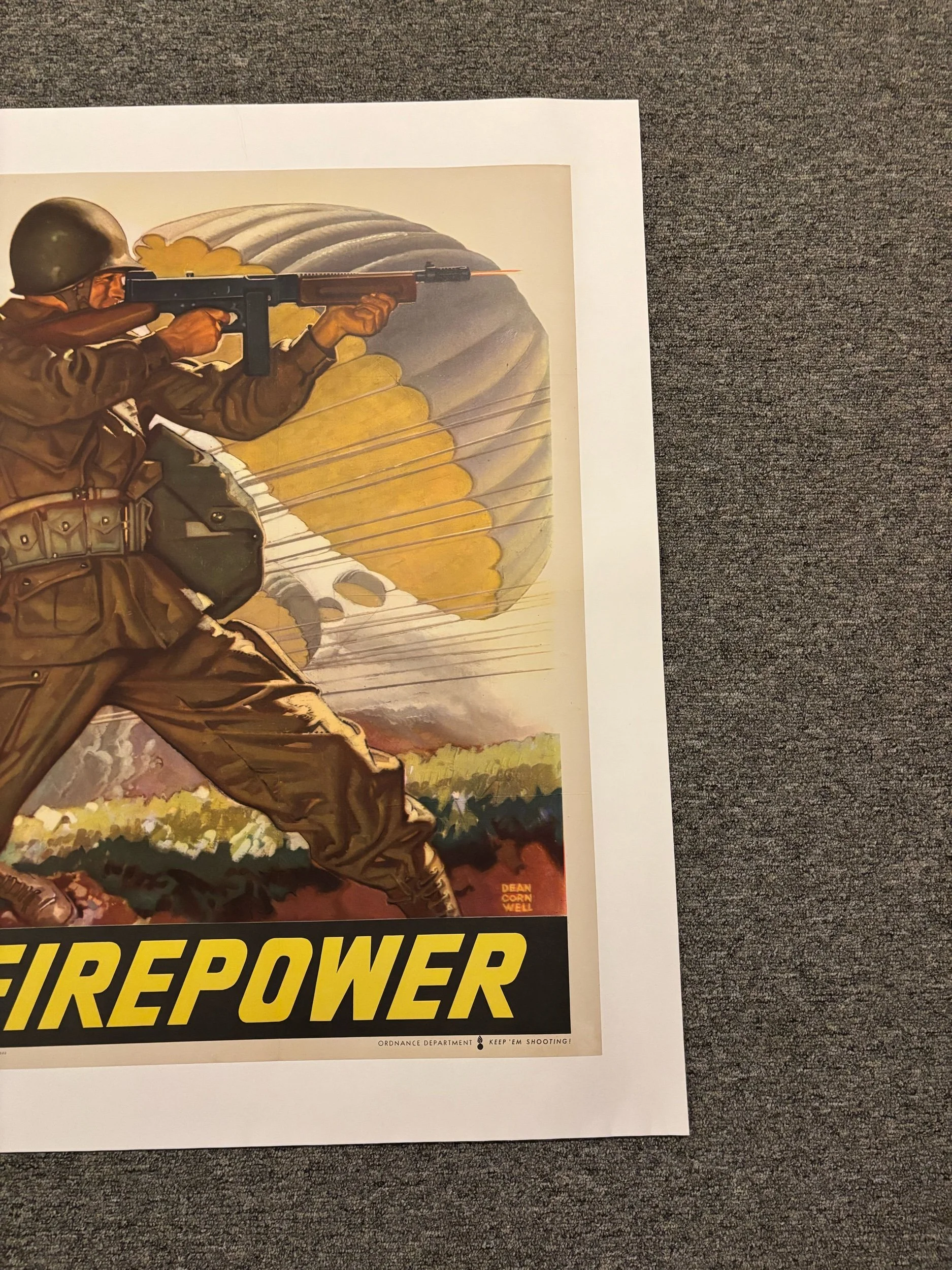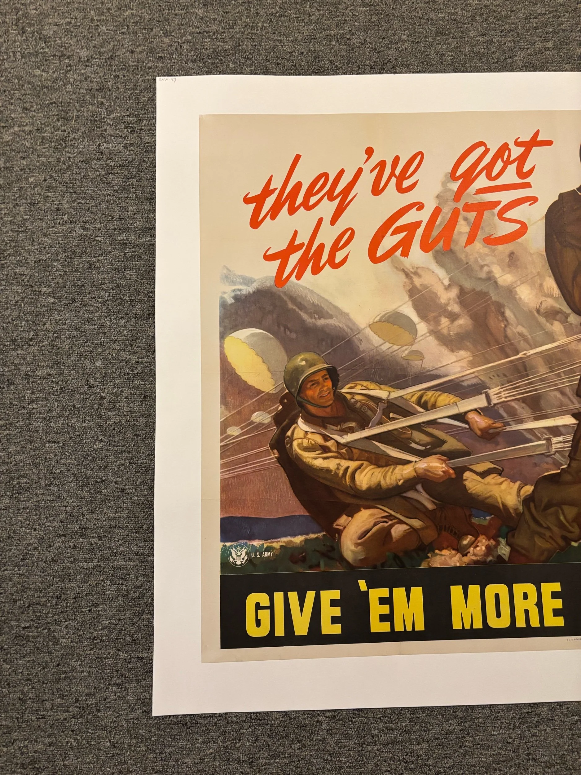 Without a doubt the most coveted and one of the rarest of all Army posters from WWII. An epic battle scene with paratroopers landing and firing away at the enemy. The purpose of this poster was to encourage scrapping fo more firepower!